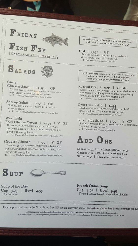 Introducing Twisted Willow, a New American bar located in Port Washington, WI. Known for its diverse menu that rotates with the seasons, this restaurant offers vegan options and a full bar. Customers rave about the delicious food, excellent service, and cozy atmosphere. From bang bang shrimp to hanger steak, each dish is crafted with care and creativity. Live music on Fridays adds to the vibrant ambiance, making it a great spot for dinner or special occasions. With friendly staff and a charming setting, Twisted Willow is a must-visit dining destination in the Ozaukee County area. Don't forget to make a reservation in advance to secure a table at this popular establishment. Experience the culinary delights and warm hospitality of Twisted Willow for yourself.
